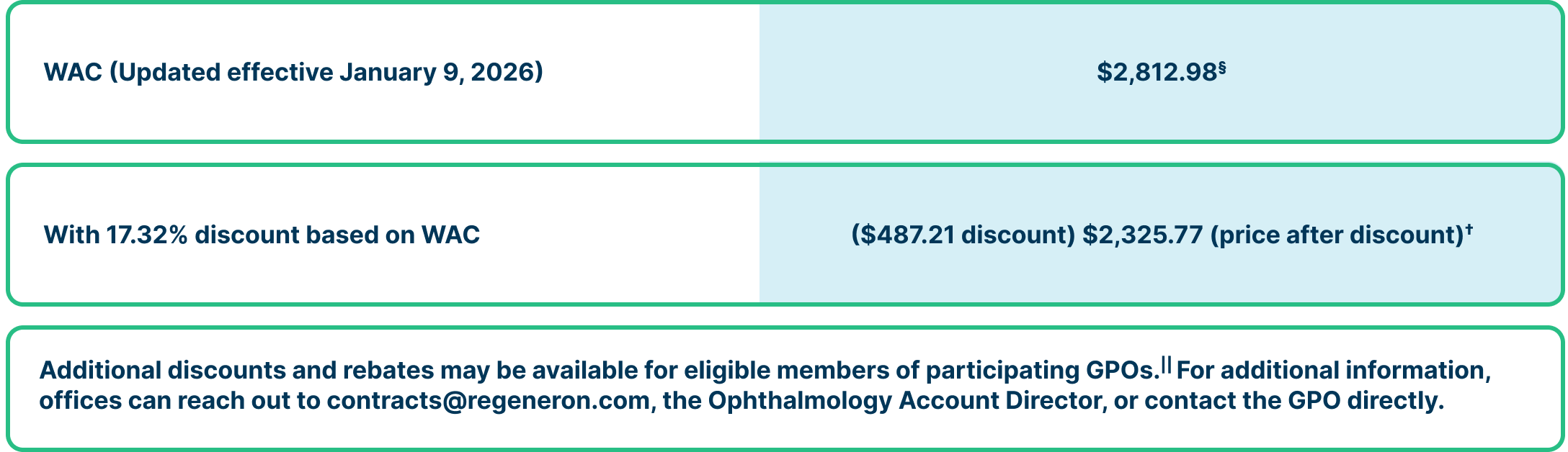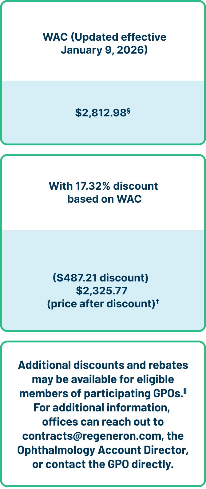 | ∥ | Rebates are subject to additional terms and conditions, including eligibility criteria. Please contact your Regeneron Ophthalmology Account Director for additional information. |